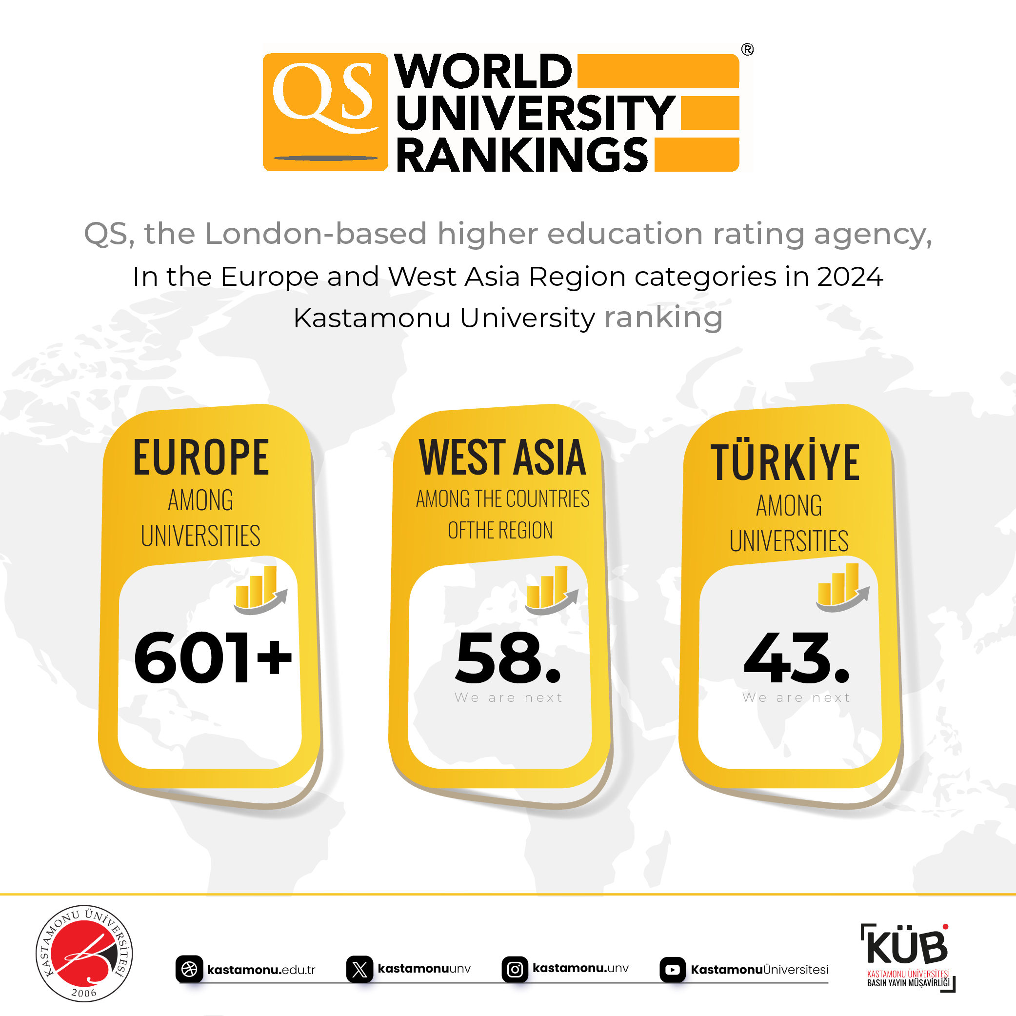Our university ranked in the 601+ band among 690 universities in Europe in the QS Regional Ranking Category, and ranked 58th among 91 universities in the West Asia Regional Countries category. Our university has achieved a significant success by ranking 43rd as one of the 73 universities in Turkey that managed to enter the ranking.