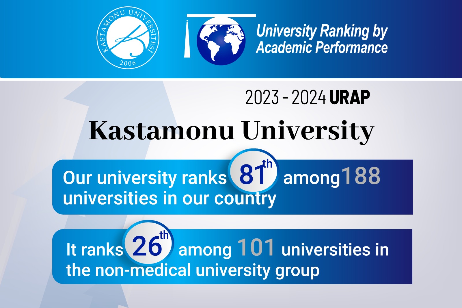 In the 2023-2024 URAP Turkey ranking of universities without a Faculty of Medicine, Kastamonu University continued its goal of becoming one of the leading higher education institutions with a total score of 621.5 points in all 8 categories with article score, citation score, scientific document score, doctorate score, faculty member / student score, international cooperation score, domestic cooperation score and TÜBİTAK project score, showing an increase compared to last year.