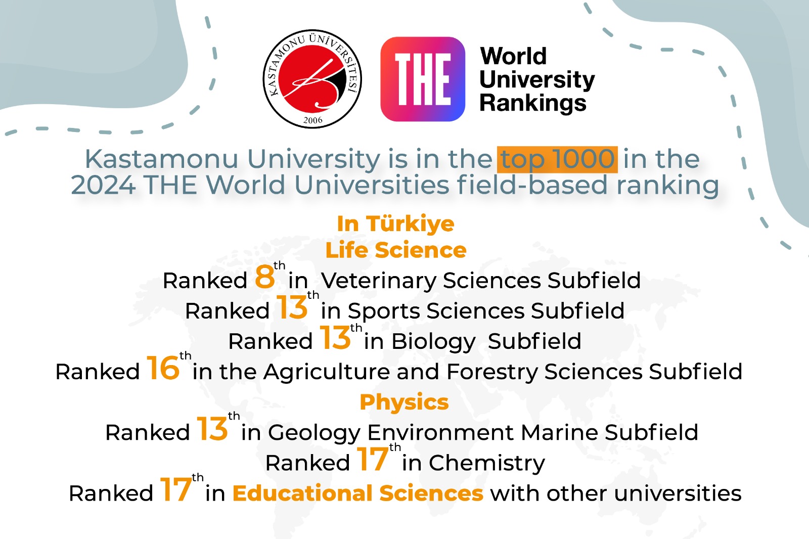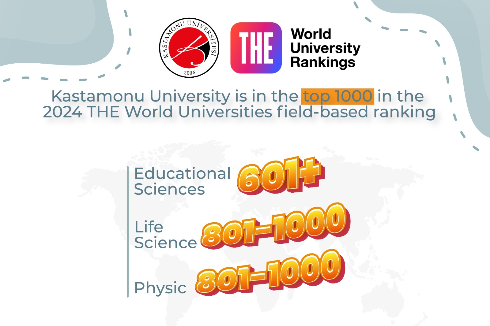 Kastamonu University has achieved remarkable success in different fields in the 2024 World University field-based Rankings prepared by Times Higher Education (THE) based on the parameters determined. Kastamonu University ranked among the world's top 1000 universities in 3 fields (Education, Life Sciences and Physical Sciences) in the ranking based on 11 different fields. Kastamonu University has achieved a great success by ranking in the 601+ band in the field of Education, in the range of 801-1000 in the field of Life Sciences and in the range of 801-1000 in the field of Physical Sciences. In all of the sub-fields of Education, Life Sciences and Physical Sciences, Kastamonu University showed a very important success by being in the top 20 among the universities in Turkey that managed to enter the list.