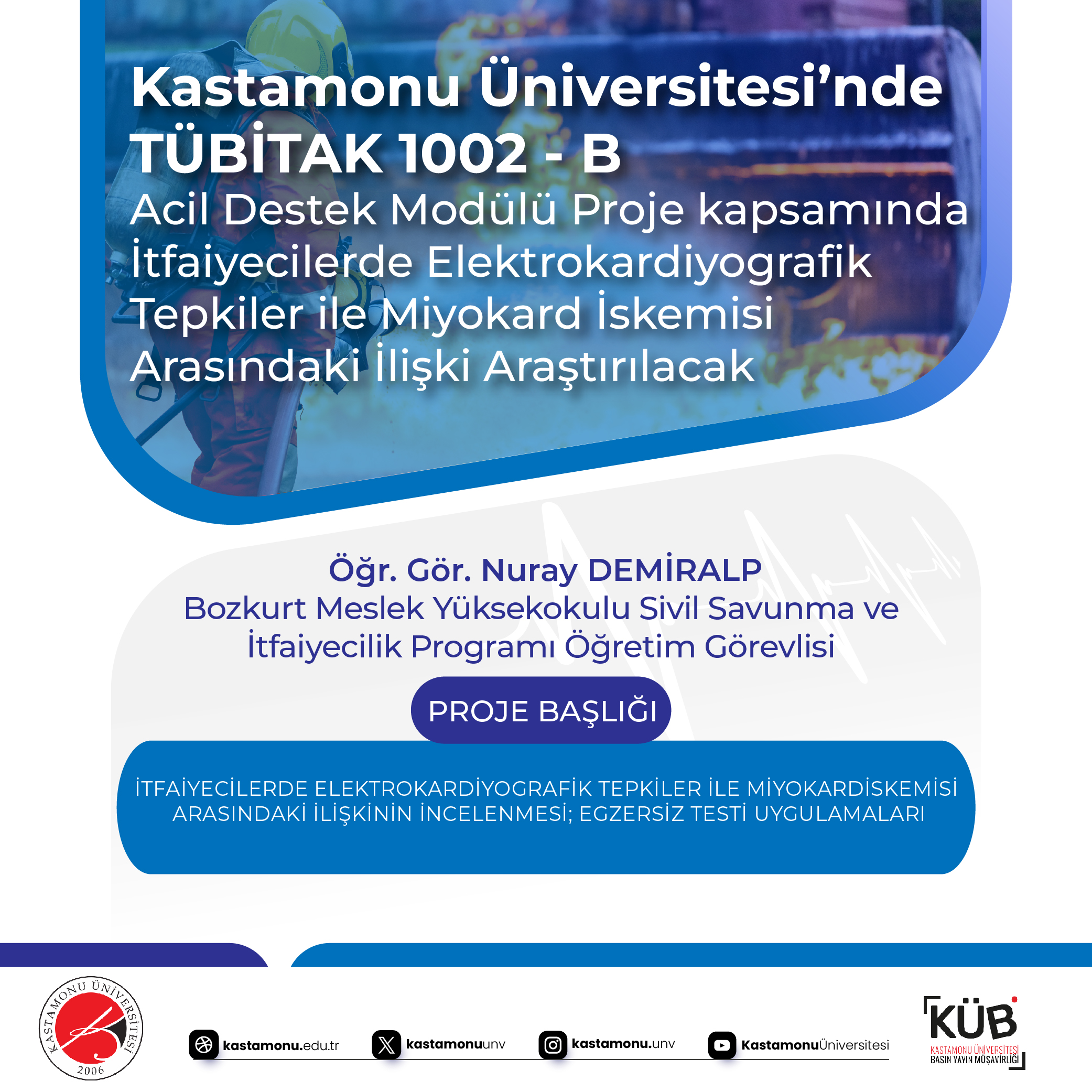 The project titled "Investigation of the Relationship Between Electrocardiographic Responses and Myocardial Ischemia in Firefighters; Exercise Test Applications", which was carried out by Nuray Demiralp, Lecturer of Civil Defense and Firefighting Program of Bozkurt Vocational School of our University, was accepted within the scope of TÜBİTAK 1002-B Emergency Support Module and was entitled to receive support.
