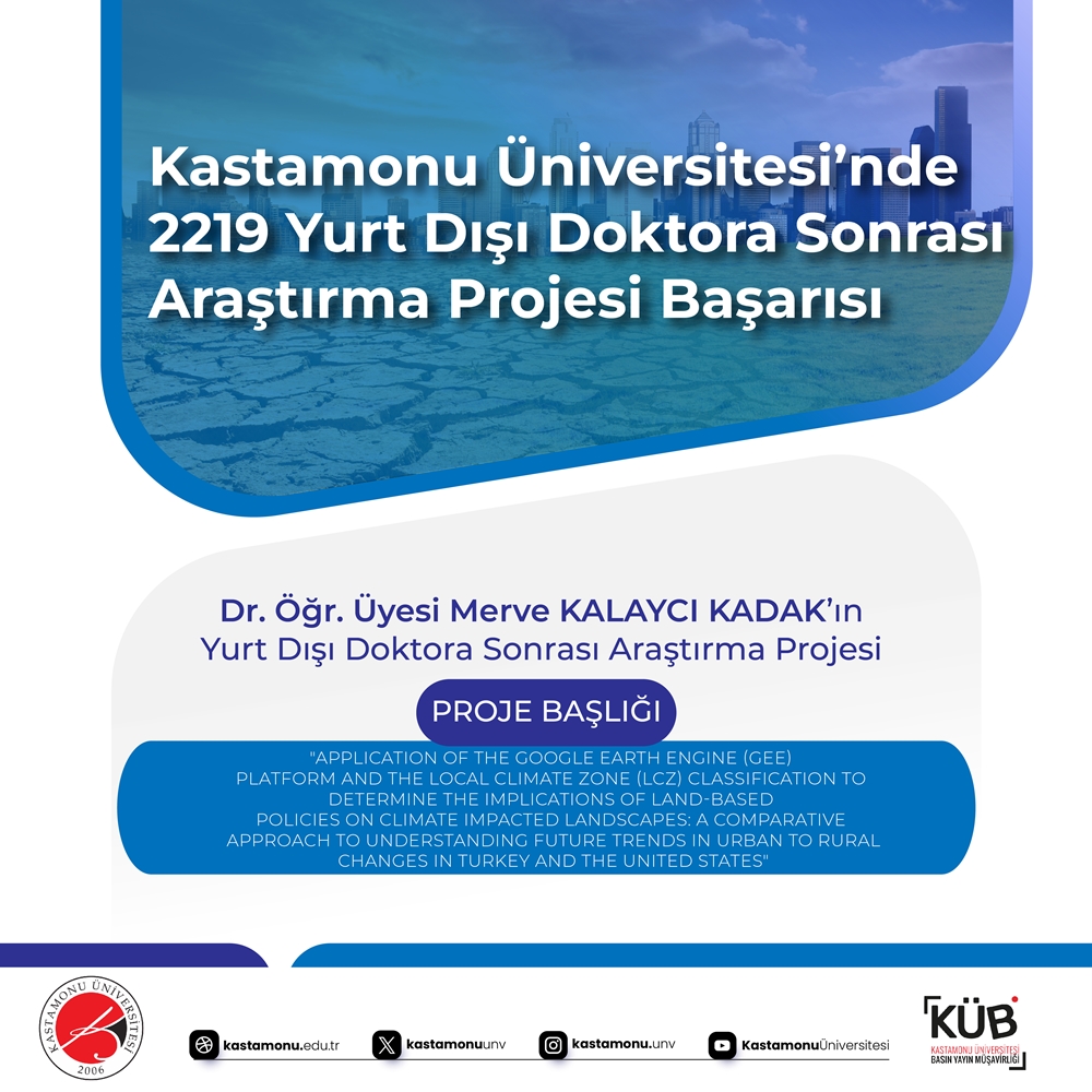 Kastamonu University Faculty of Engineering and Architecture, Department of Landscape Architecture faculty member Assist. Prof. Merve Kalaycı Kadak's "Application of the Google Earth Engine (GEE) platform and the Local Climate Zone (LCZ) classification to determine the implications of land-based policies on climate impacted landscapes: A comparative approach to understanding future trends in urban to rural changes in Turkey and the United States" was awarded a grant by the Scientific and Technological Research Council of Turkey (TÜBİTAK).
