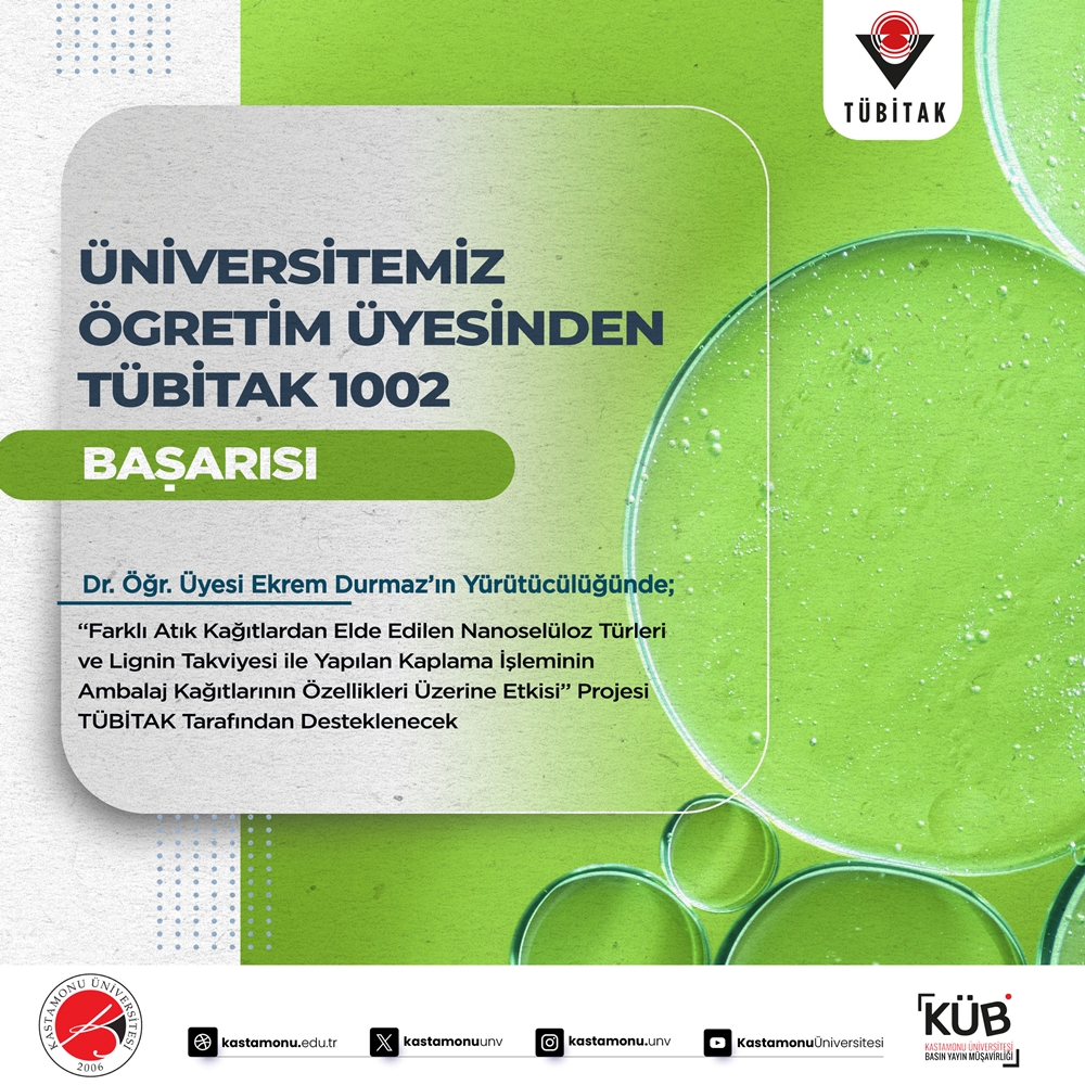 The project titled "Nanocellulose Types Obtained from Different Waste Papers and the Effect of Coating Process with Lignin Reinforcement on the Properties of Packaging Papers", carried out by Assistant Professor Ekrem Durmaz, one of the faculty members of the Forest Industrial Engineering Faculty of our University, was entitled to receive TÜBİTAK 1002-A Rapid Support Module grant.