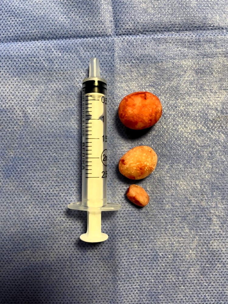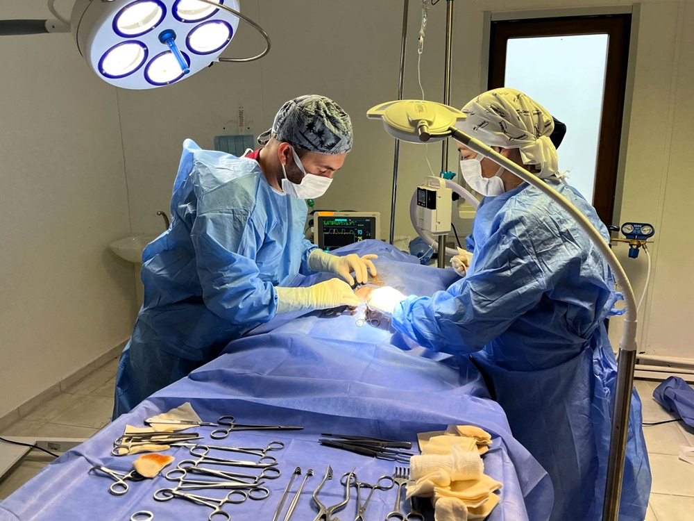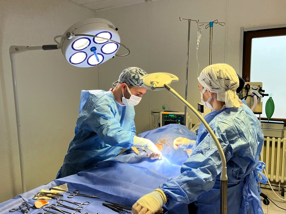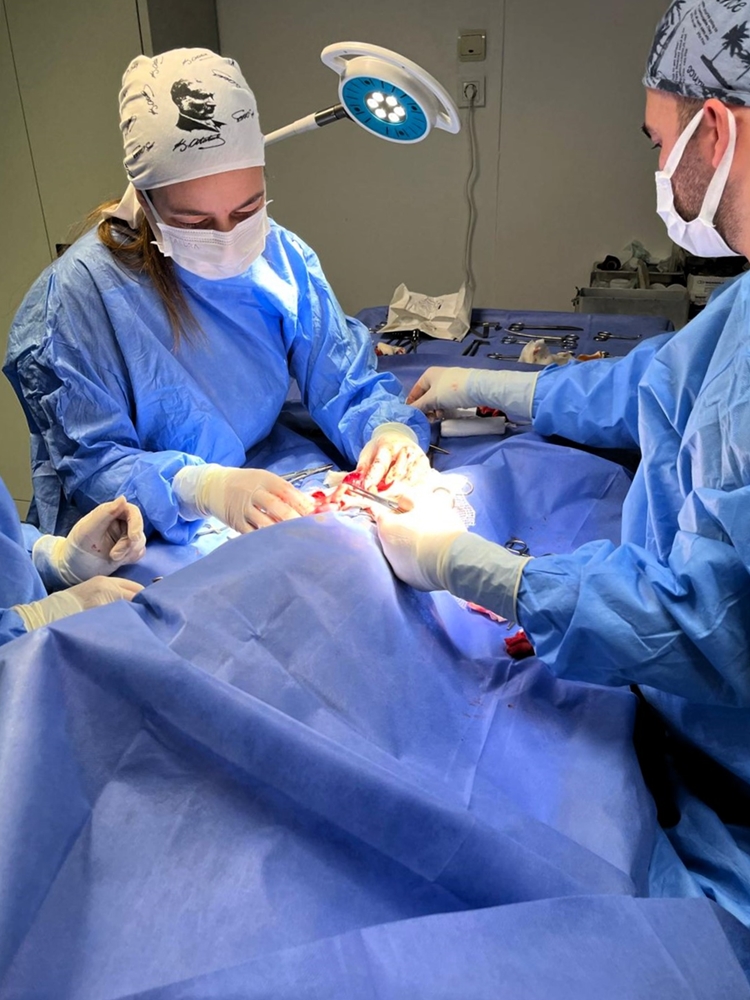 The surgery was performed on February 15, 2024, accompanied by faculty members of the Department of Surgery and Obstetrics-Gynecology, and lasted approximately 2 hours. During the operation, 3 stones covering approximately 90% of the dog's bladder, as well as the uterus and ovaries, were removed and neutered. Considering that the Pug had respiratory problems during this difficult surgery, the meticulous work and experience of the surgical team were vital.