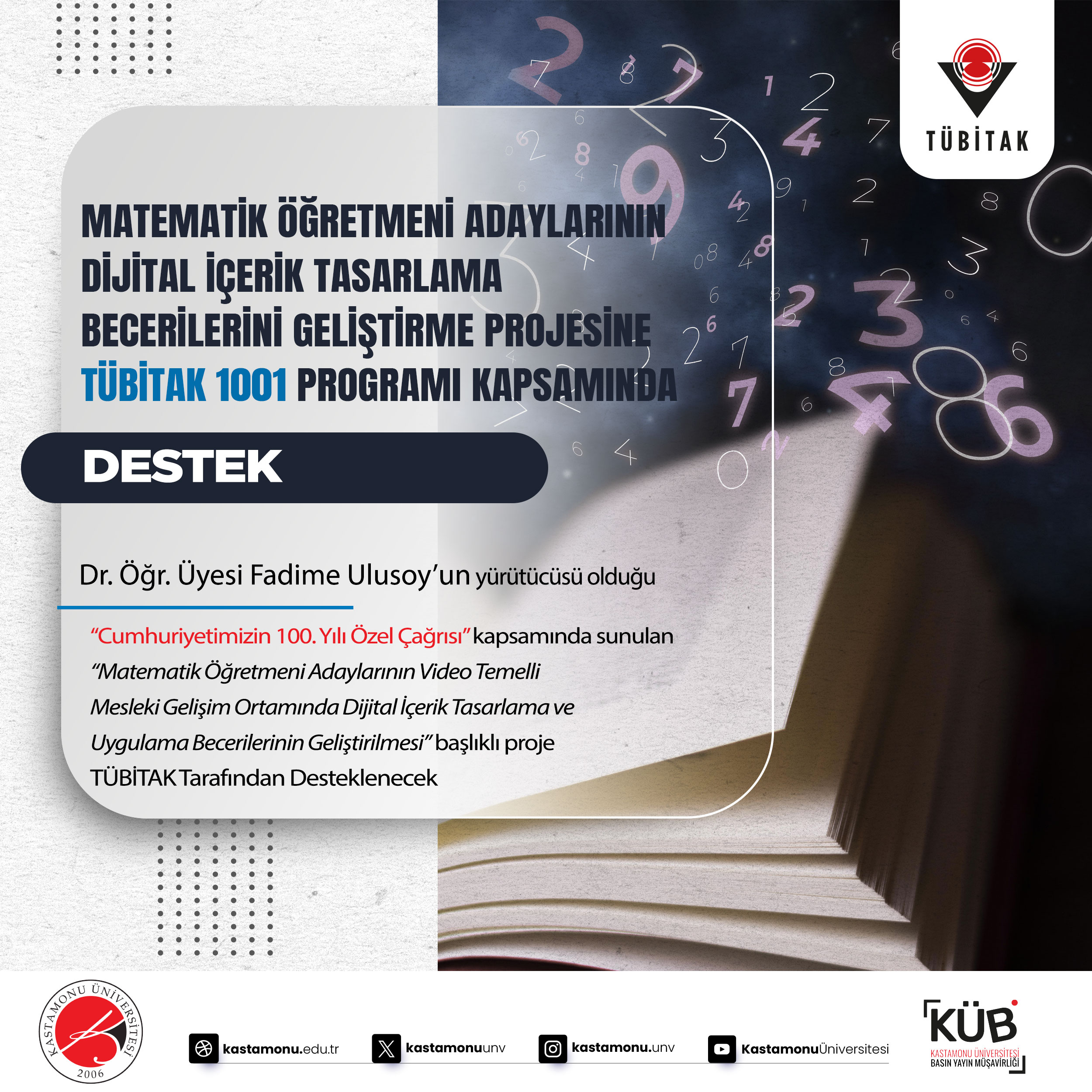 To support research projects that aim to understand the historical, cultural, political, social and economic dynamics of our Republic and to offer new perspectives for the future vision; Among the projects submitted to the “100 Years of Our Republic Special Call” opened within the scope of the 1001-Scientific and Technological Research Projects Support Program carried out by the Scientific and Technological Research Council of Turkey (TÜBİTAK) Research Support Programs Directorate (ARDEB), the project titled “Improving the Digital Content Design and Implementation Skills of Prospective Mathematics Teachers in a Video-Based Professional Development Environment”, which was carried out by Assist. Prof.Dr. Fadime Ulusoy, was accepted by TÜBİTAK and awarded 751. 000 TL support for 2 years.