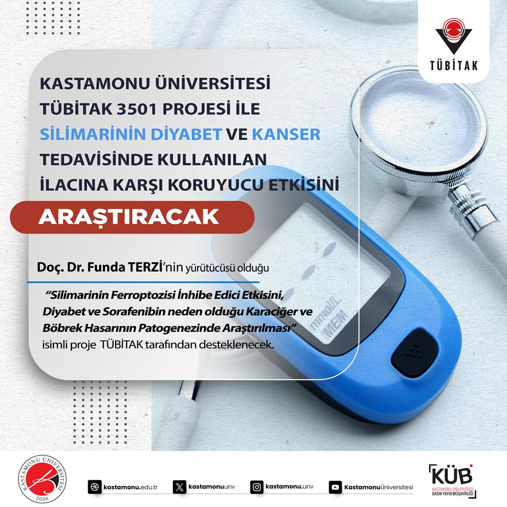 Kastamonu University Faculty of Veterinary Medicine, Department of Preclinical Sciences, Department of Veterinary Pathology faculty member Assoc. Prof. Dr. Funda Terzi's project titled "Investigation of the Ferroptosis Inhibiting Effect of Silymarin in the Pathogenesis of Diabetes and Sorafenib-Induced Liver and Kidney Damage" was entitled to be supported within the scope of TÜBİTAK 3501 - Career Development Program.
